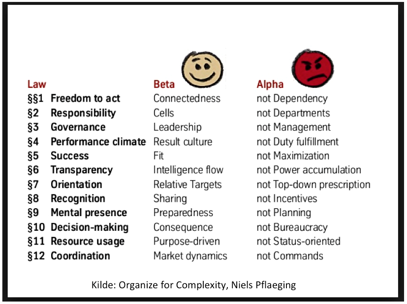 Alfa er det, vi kalder den hierarkiske organisationsform med command-and-control Taylorisme. Ses ofte som en matrixorganisering.